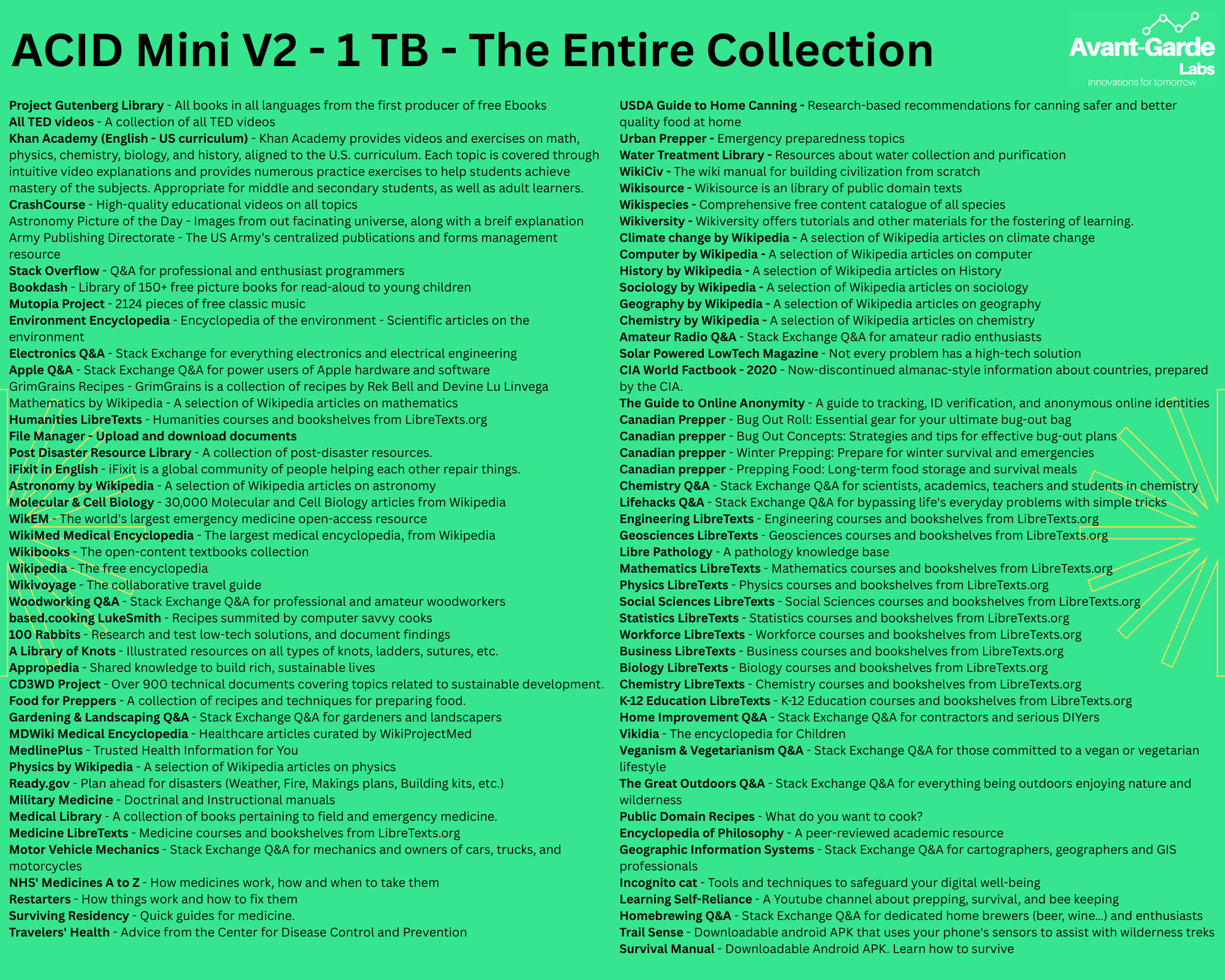 This product is unique to the ACID Mini V1 because of its ability to be easily updated with any .zim resources you'd like. It also has the ability to store your own files and then be accessible from any connected device over WiFi.